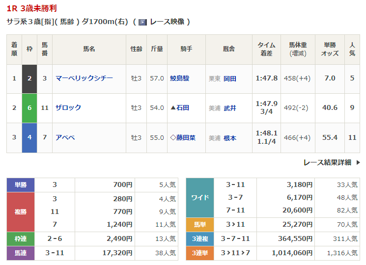 ◎マーベリックシチー(5人気)1着 単勝700円、複勝280円