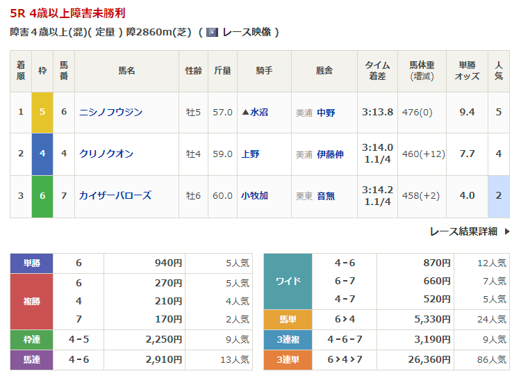 ◎ニシノフウジン(5人気)1着 単勝940円、複勝270円