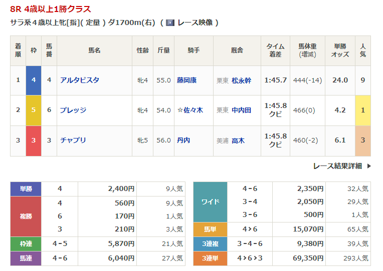 ◎アルタビスタ(9人気)1着 単勝2,400円、複勝560円