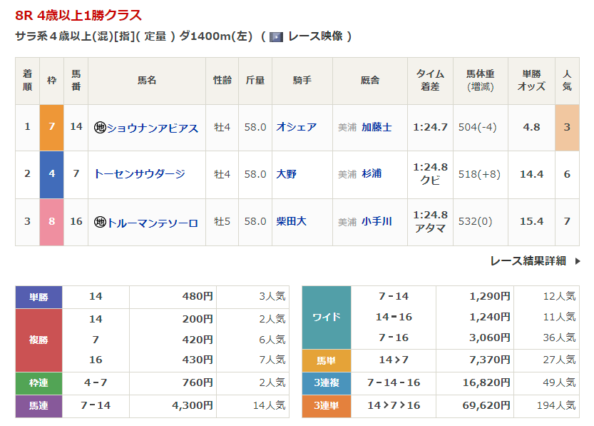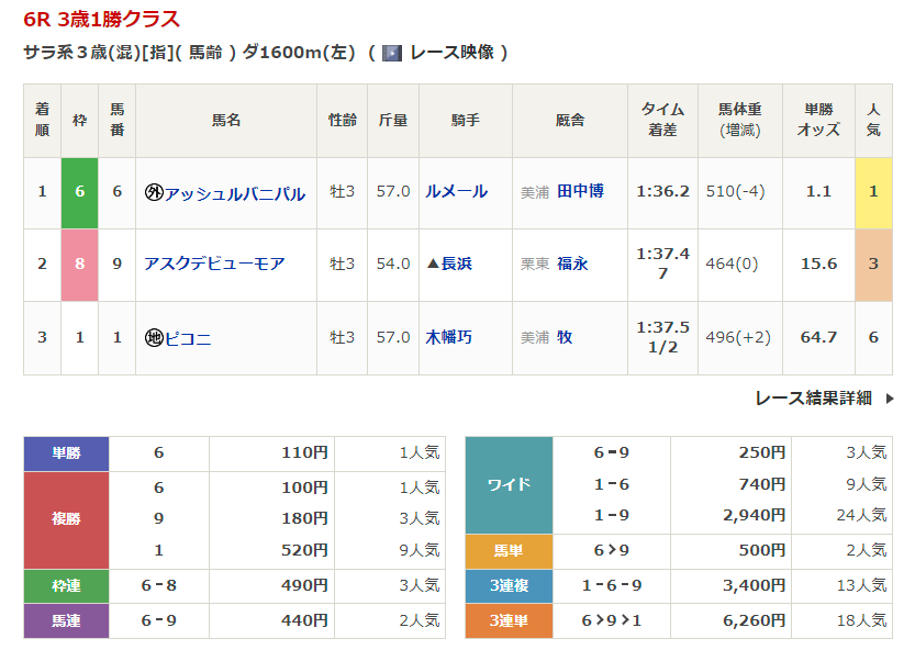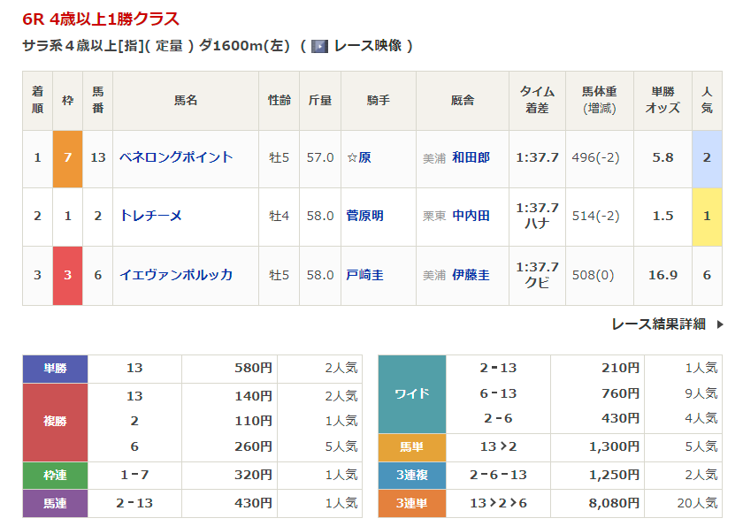 ◎マテンロウブラボー(6人気)1着 単勝1,370円、複勝380円