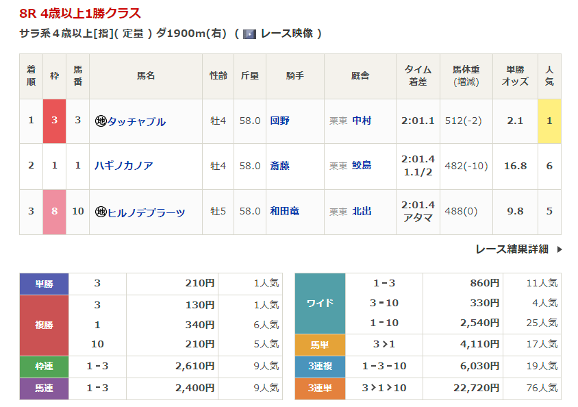 ◎ロコポルティ(8人気)1着 単勝2,220円、複勝600円