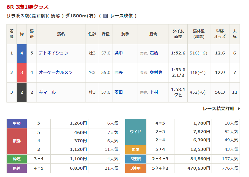 ◎ラケマーダ(6人気)1着 単勝1,470円、複勝350円
