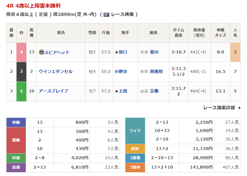 ◎インビンシブルセージ(4人気)1着 単勝890円、複勝200円
