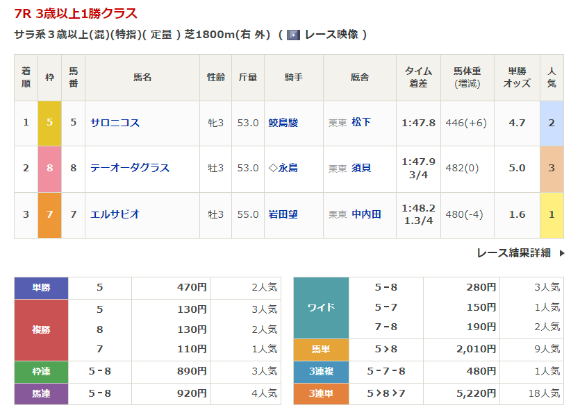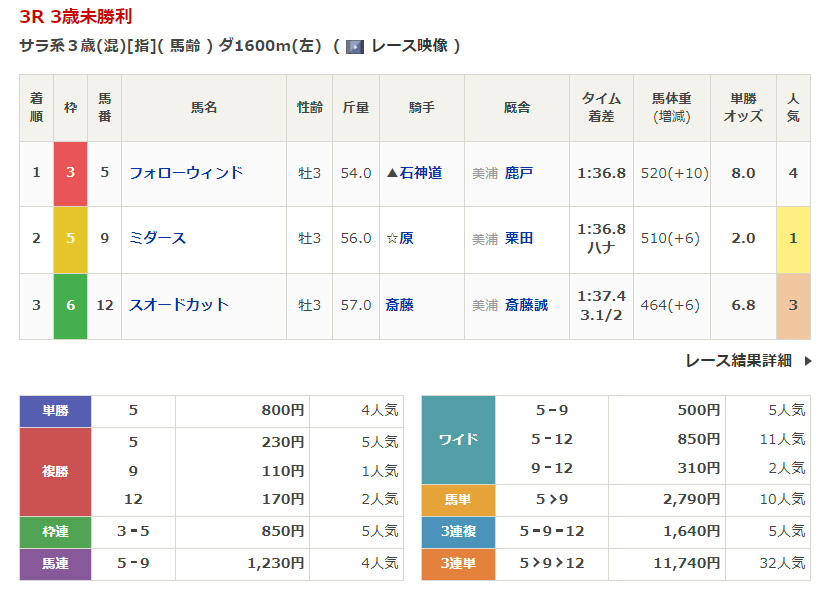 ◎フォローウィンド(4人気)1着 単勝800円、複勝230円