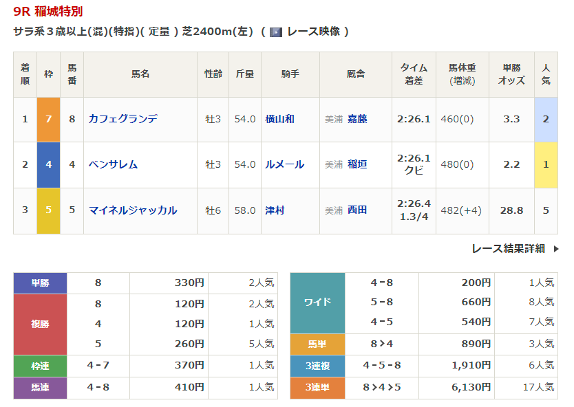 ◎マイネルジャッカル(5人気)3着 複勝260円