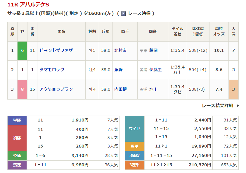 ◎ビヨンドザファザー(7人気)1着 単勝1,910円、複勝490円