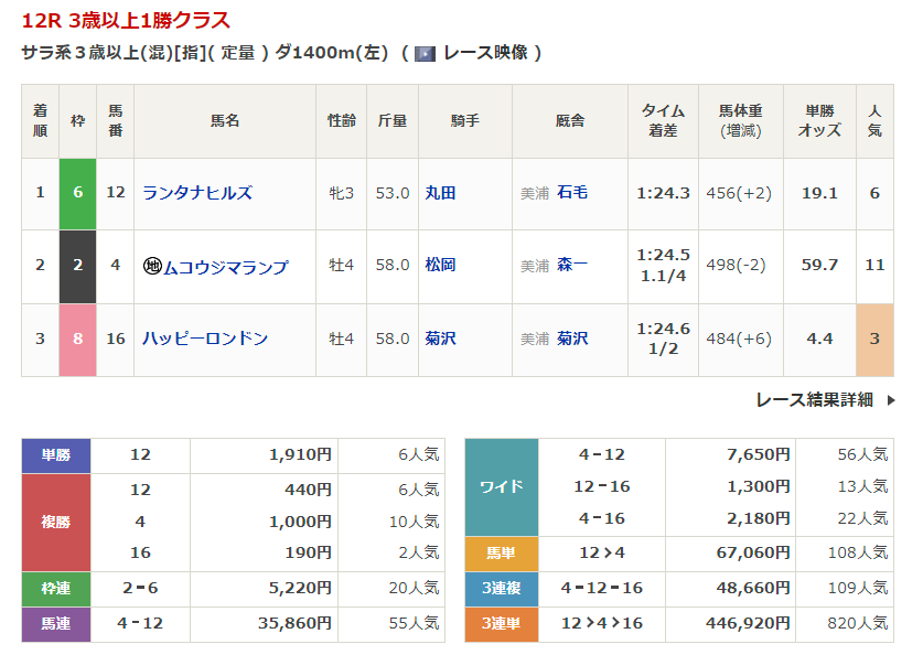 ◎ムコウジマランプ(11人気)2着 複勝1,000円