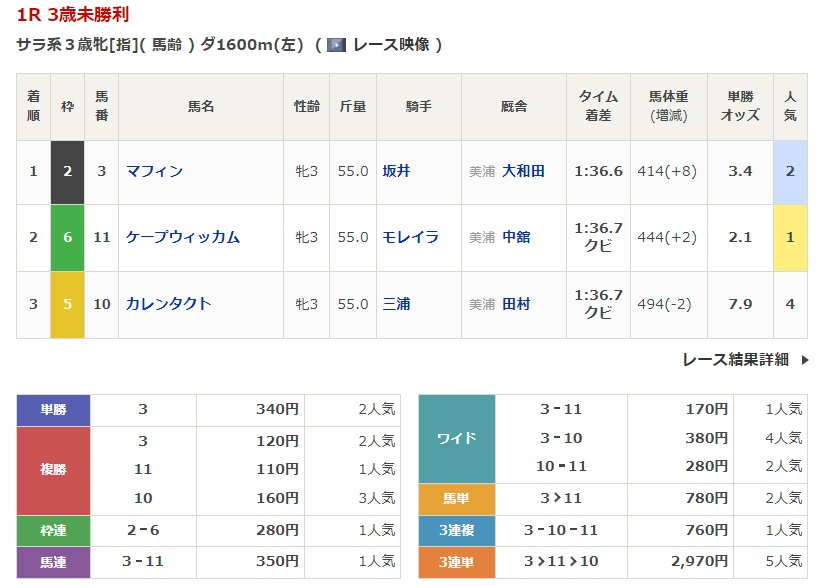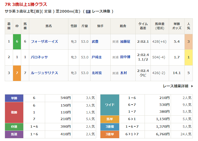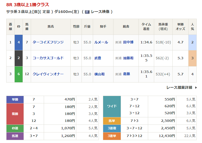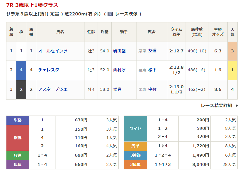 ◎オールセインツ(3人気)1着 単勝630円、複勝150円