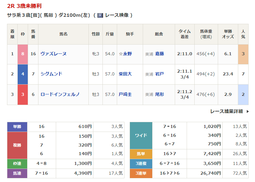 ◎ヴラディア(7人気)3着 複勝230円 - 6/1【東京2R】3歳未勝利