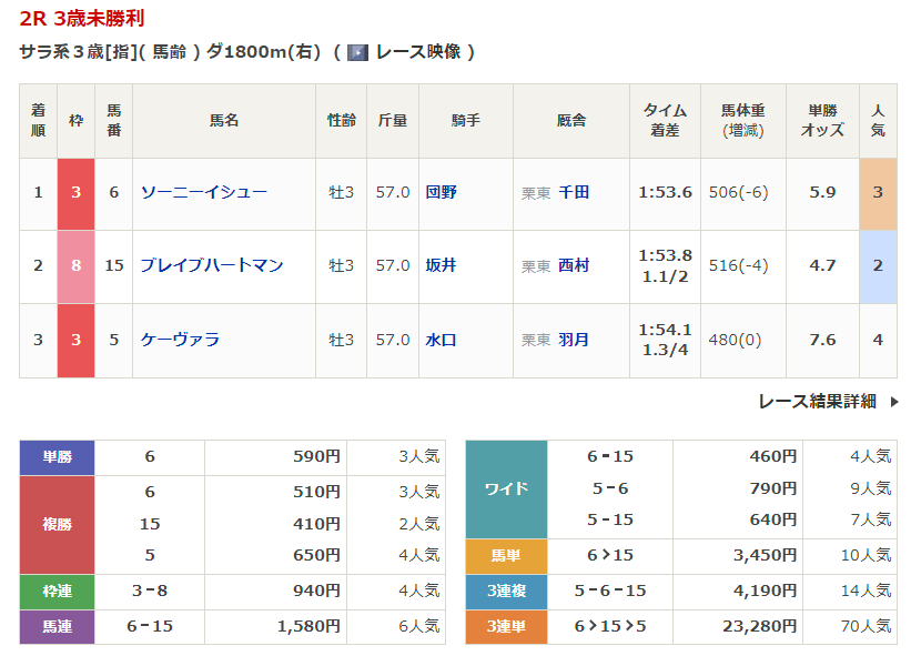 ◎ウェイトゥゴー(4人気)1着 単勝640円、複勝220円 - 6/2【京都4R】3歳未勝利