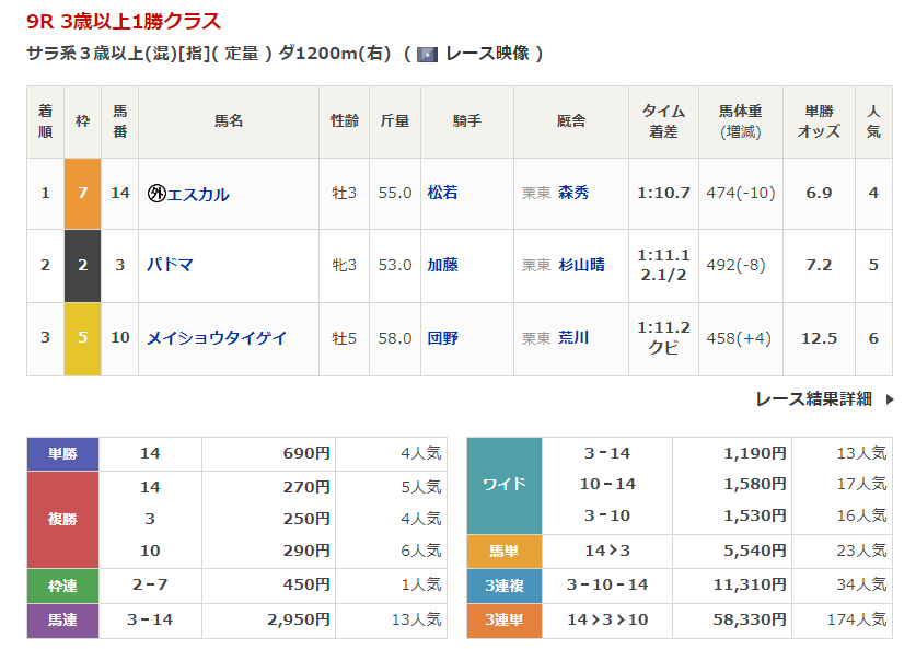 ◎エスカル(4人気)1着 単勝690円、複勝270円