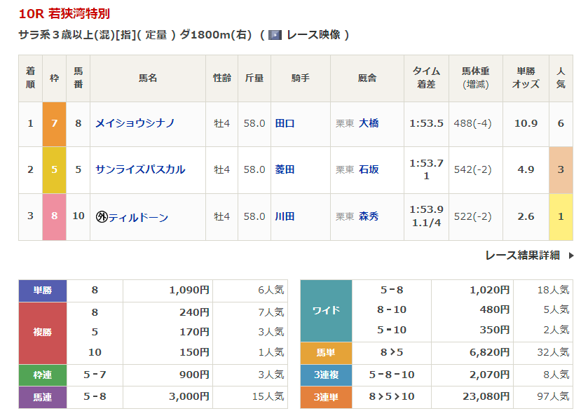 ◎メイショウシナノ(6人気)1着 単勝1,090円、複勝240円