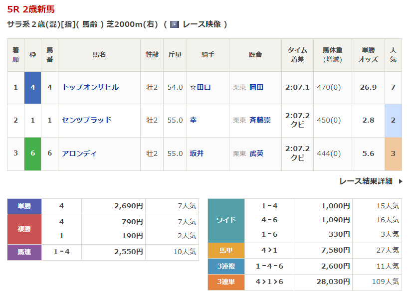 ◎トップオンザヒル(7人気)1着 単勝2,690円、複勝790円