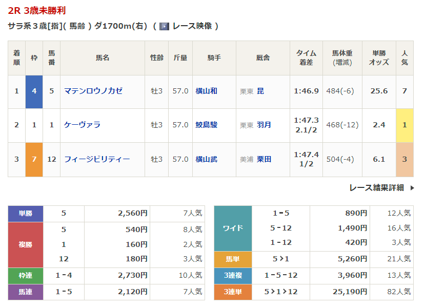 ◎マテンロウノカゼ(7人気)1着 単勝2,560円、複勝540円