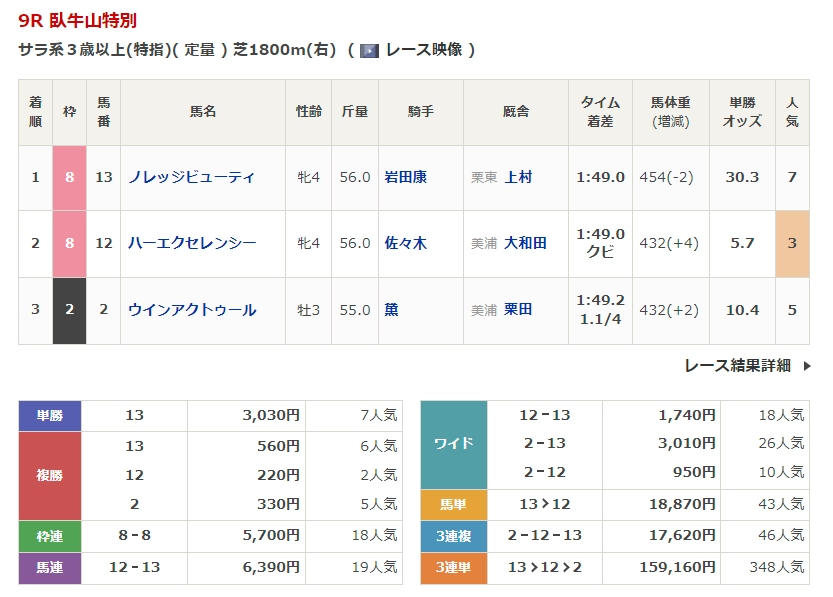 ◎ノレッジビューティ(7人気)1着 単勝3,030円、複勝560円