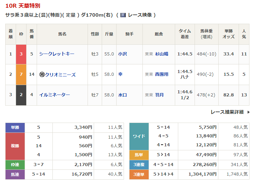 ◎シークレットキー(11人気)1着 単勝3,340円、複勝940円