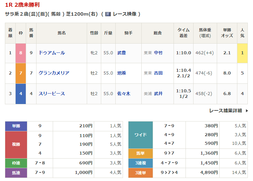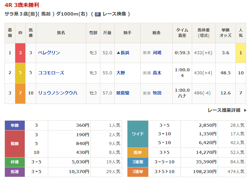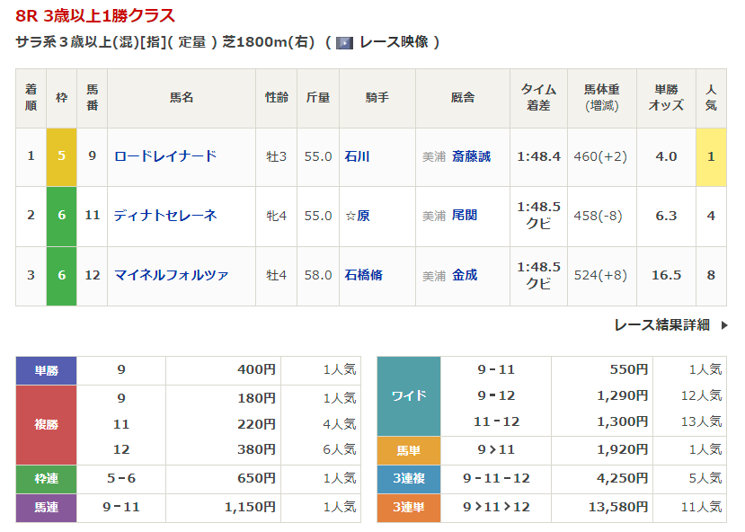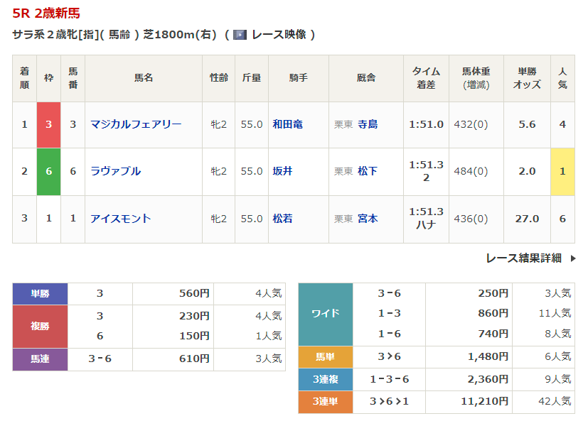 ◎ピコローズ(5人気)1着 単勝800円、複勝210円
