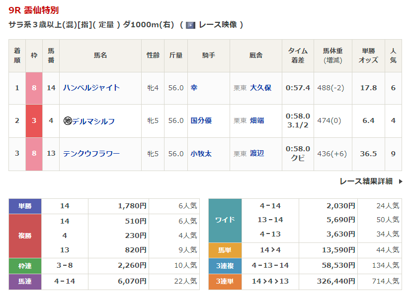 ◎ハンベルジャイト(6人気)1着 単勝1,780円、複勝510円 - 7/13【小倉12R】3歳以上1勝クラス