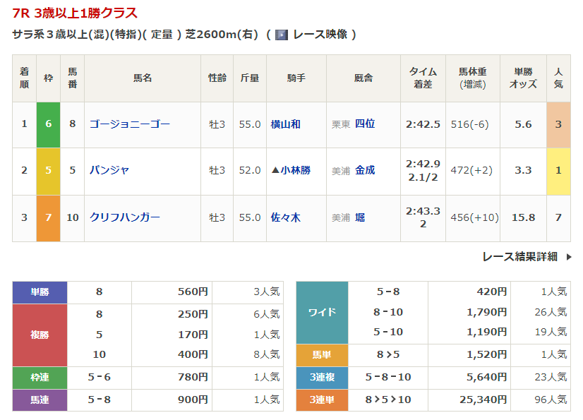 ◎ゴージョニーゴー(3人気)1着 単勝560円、複勝250円