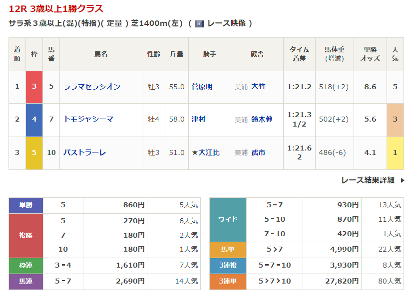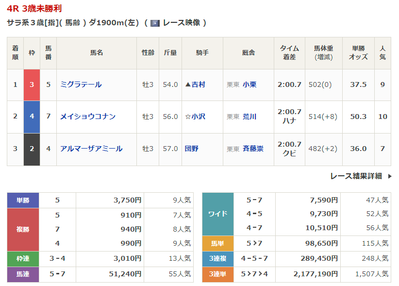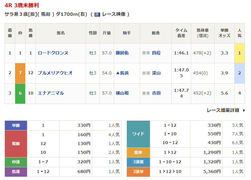 ◎ラルンエベール(4人気)1着 単勝1,010円、複勝260円