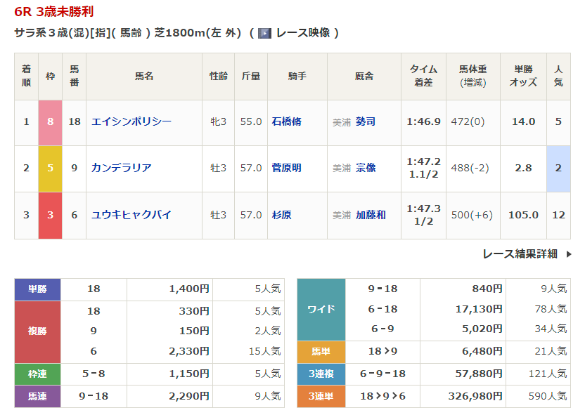 ◎エイシンポリシー(5人気)1着 単勝1,400円、複勝330円