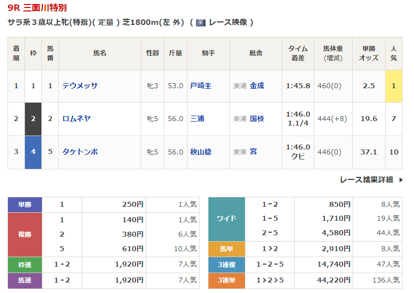 ◎メイショウコナン(10人気)2着 複勝940円 - 8/11【中京7R】3歳以上1勝クラス
