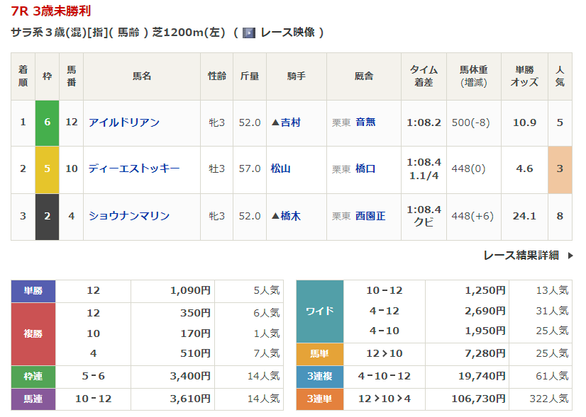 ◎アイルドリアン(5人気)1着 単勝1,090円、複勝350円