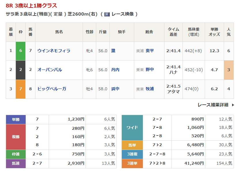◎ウインネモフィラ(6人気)1着 単勝1,230円、複勝280円