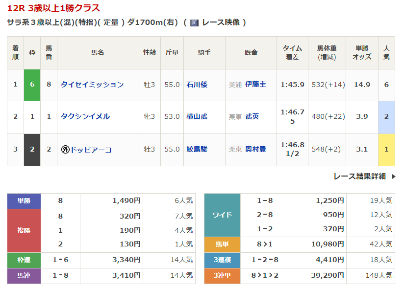 ◎タイセイミッション(6人気)1着 単勝1,490円、複勝320円