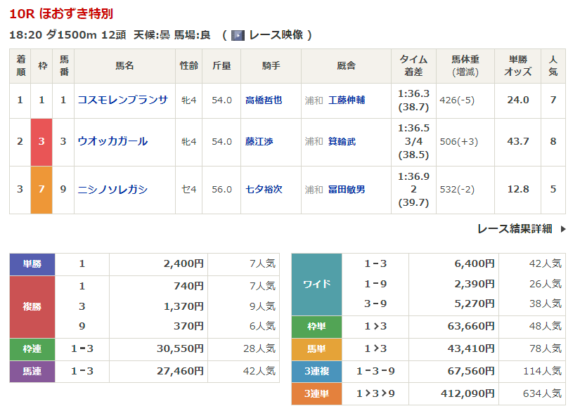 ◎コスモレンブランサ(7人気)1着 単勝2,400円、複勝740円