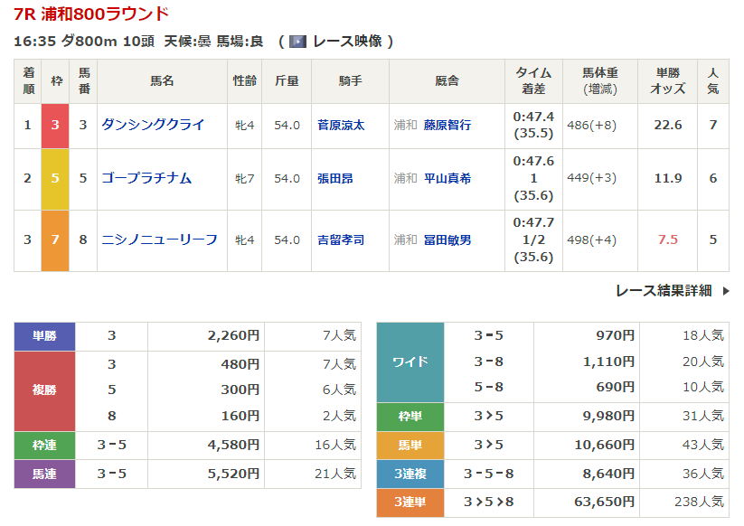 ◎ダンシングクライ(7人気)1着 単勝2,260円、複勝480円