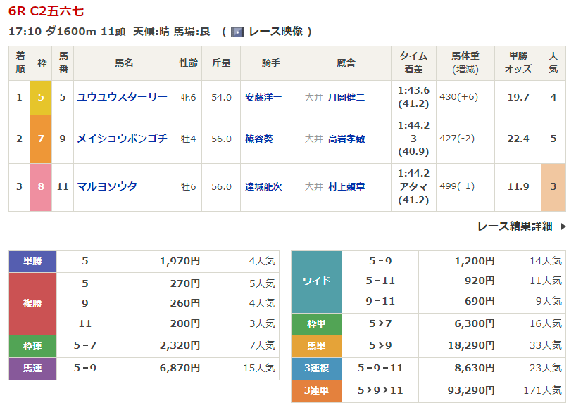 ◎ユウユウスターリー(4人気)1着 単勝1,970円、複勝270円
