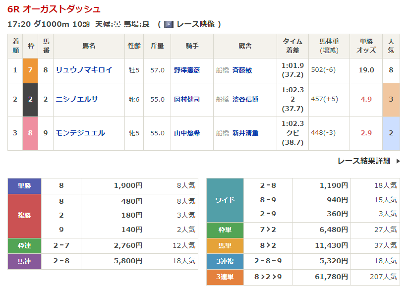 8月は単勝的中のレースが37Rありました。その中で高配当レースは以下の通りです。