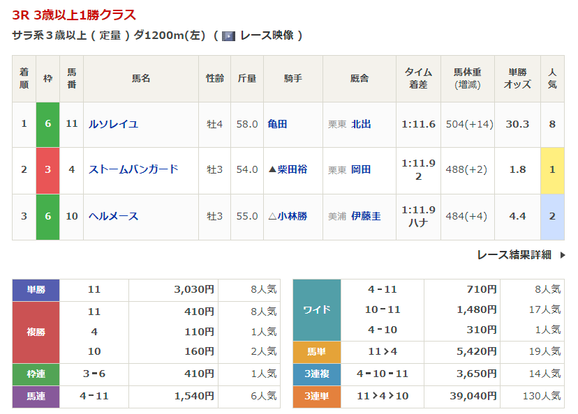 ◎ルソレイユ(8人気)1着 単勝3,030円、複勝410円