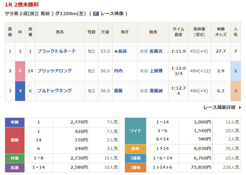 ◎ブラックトルネード(7人気)1着 単勝2,770円、複勝420円