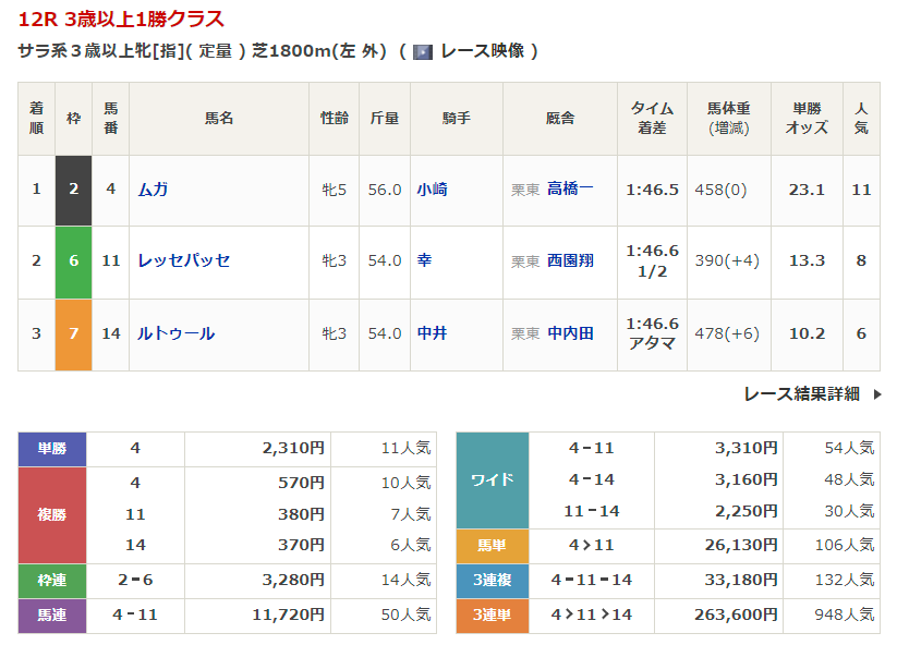 ◎ムガ(11人気)1着 単勝2,310円、複勝570円