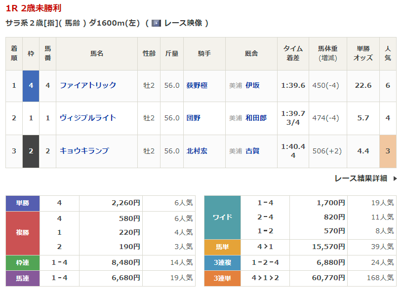 ◎ファイアトリック(6人気)1着 単勝2,260円、複勝580円