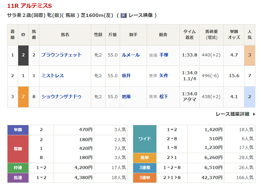 ◎ブルーストッキング(2人気)1着 単勝560円、複勝200円