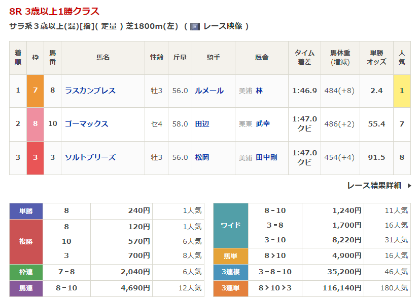◎ルソレイユ(8人気)1着 単勝3,030円、複勝410円