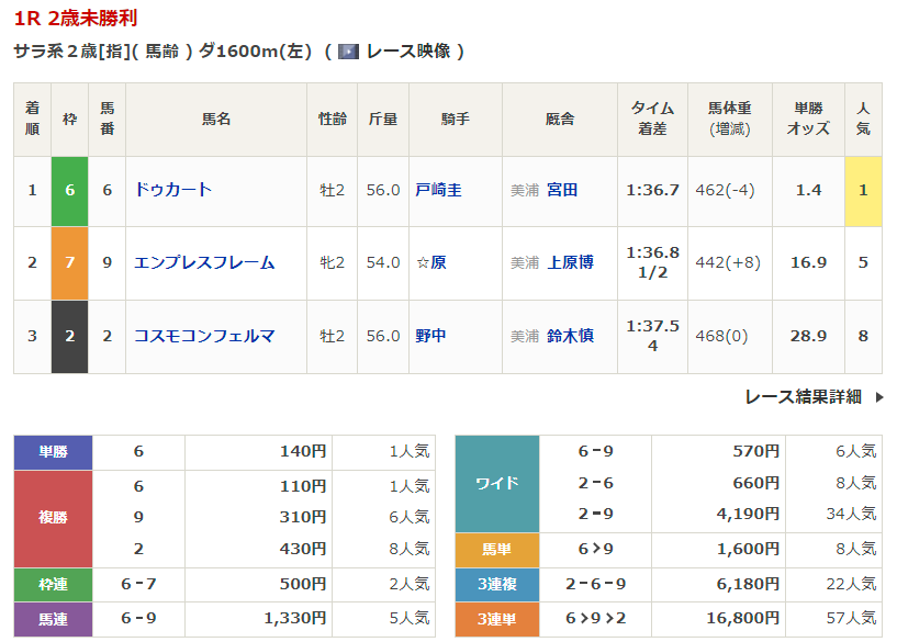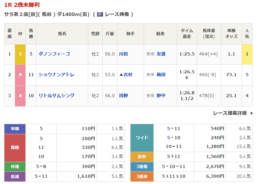 ◎ドンレパルス(7人気)1着 単勝1,520円、複勝310円 - 10/6【新潟1R】2歳未勝利