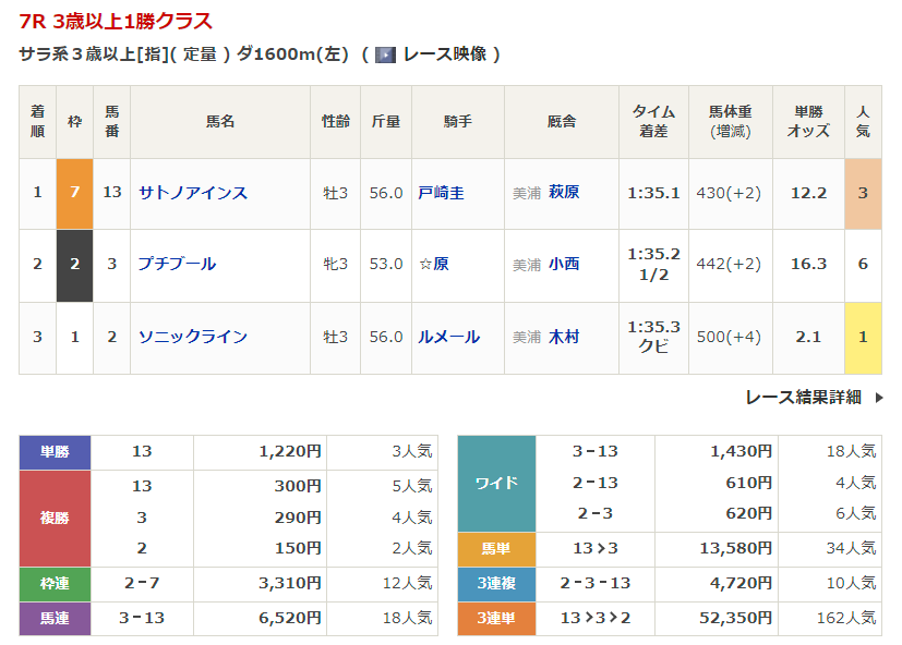 ◎サトノアインス(3人気)1着 単勝1,220円、複勝300円