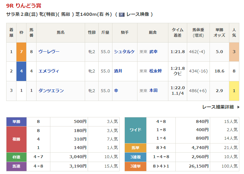 ◎ルソレイユ(8人気)1着 単勝3,030円、複勝410円 - 10/5【新潟8R】3歳以上1勝クラス