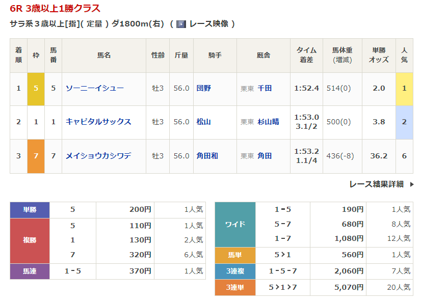 ◎メイショウカシワデ(6人気)3着 複勝320円