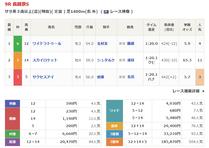 その他にも日曜京都の長岡京ステークスで◎スカイロケット(11番人気)2着、土曜新潟メインの鳥屋野特別では◎シュガーコルト(11番人気)2着、◎ワイルドベティ(9番人気)3着の穴馬のダブル的中など人気薄の穴馬が多数好走してくれました。