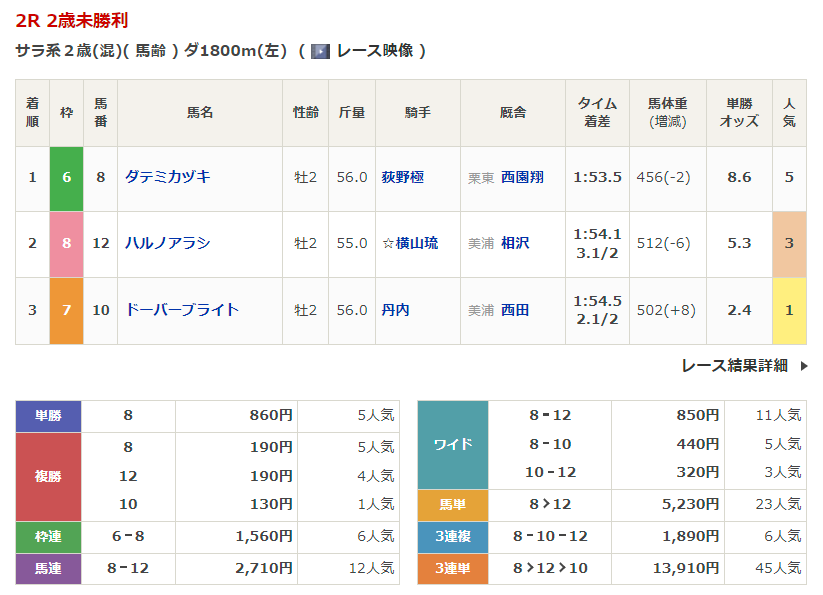 ◎ダテミカヅキ(5人気)1着 単勝860円、複勝190円
