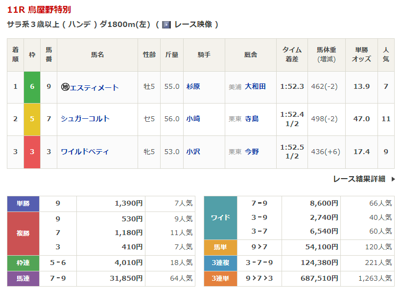 ◎シュガーコルト(11人気)2着 複勝1,180円