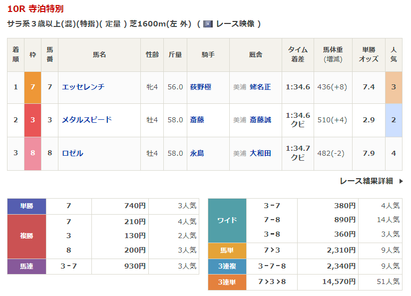 ◎エッセレンチ(3人気)1着 単勝740円、複勝210円