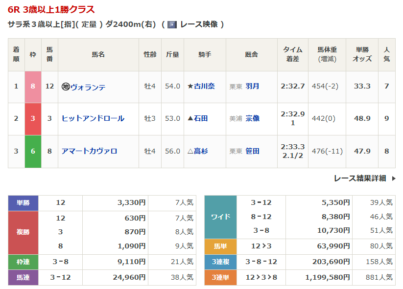 ◎ヴォランテ(7人気)1着 単勝3,330円、複勝630円