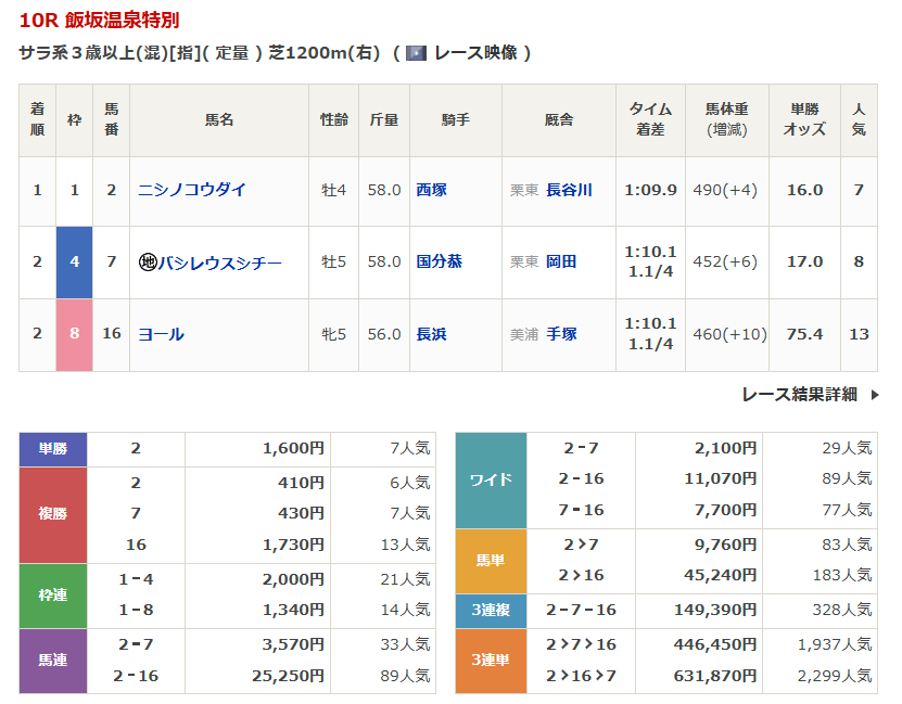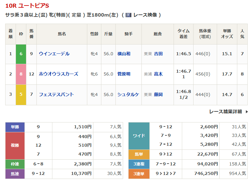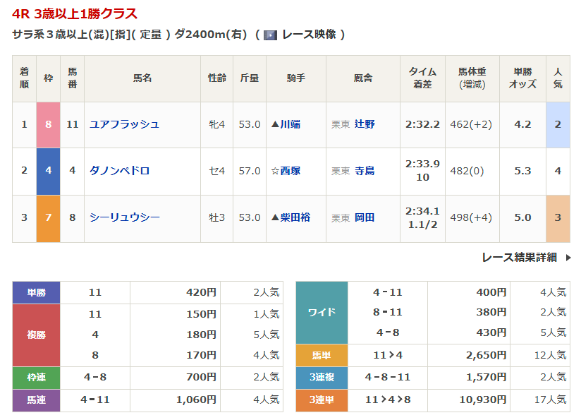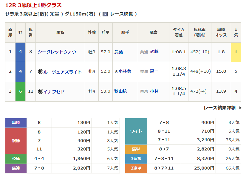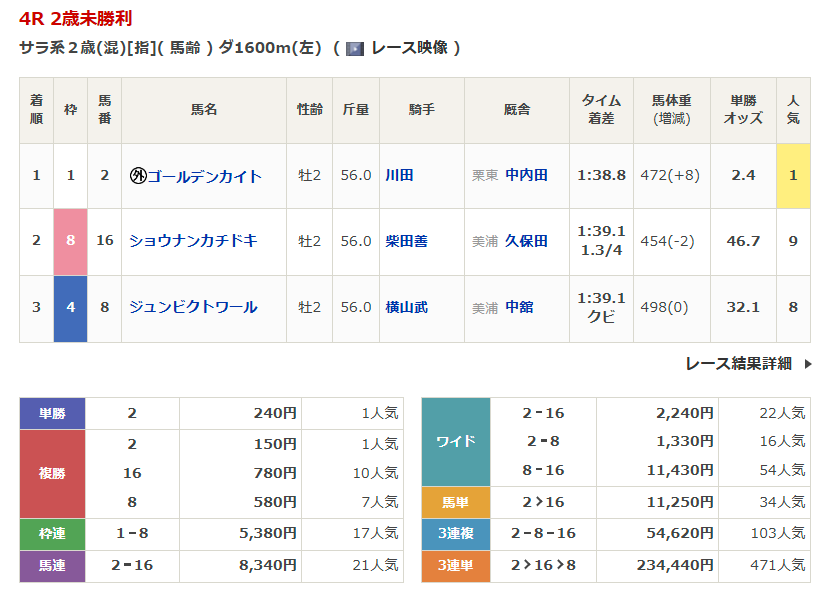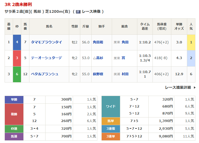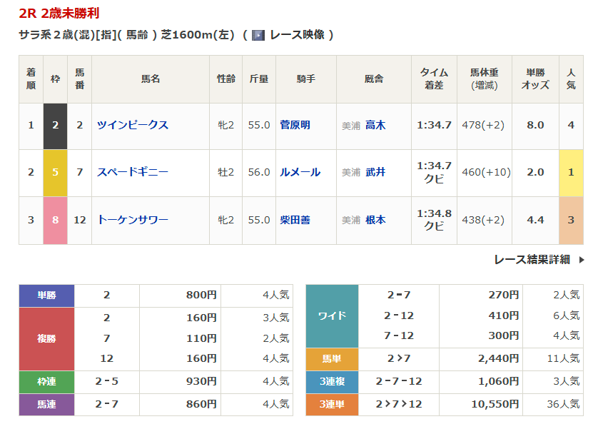 ◎ツインピークス(4人気)1着 単勝800円、複勝160円