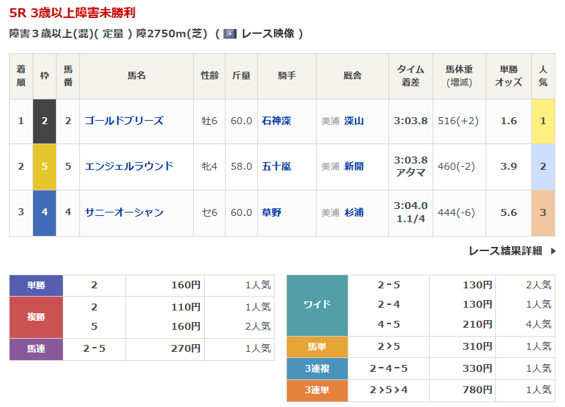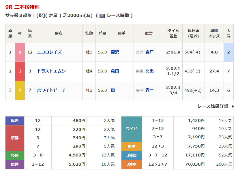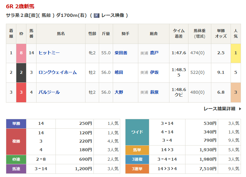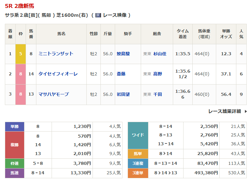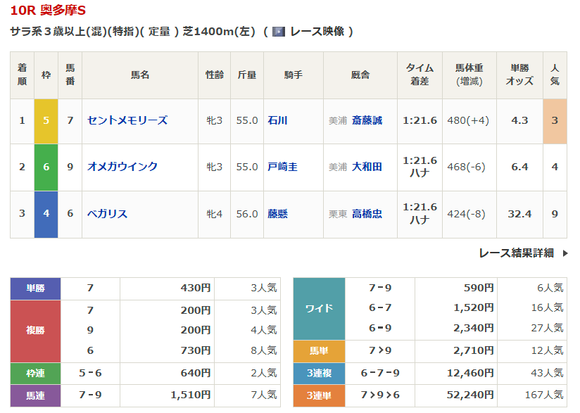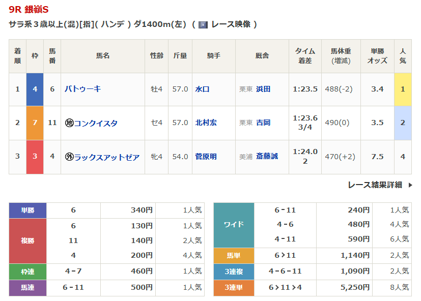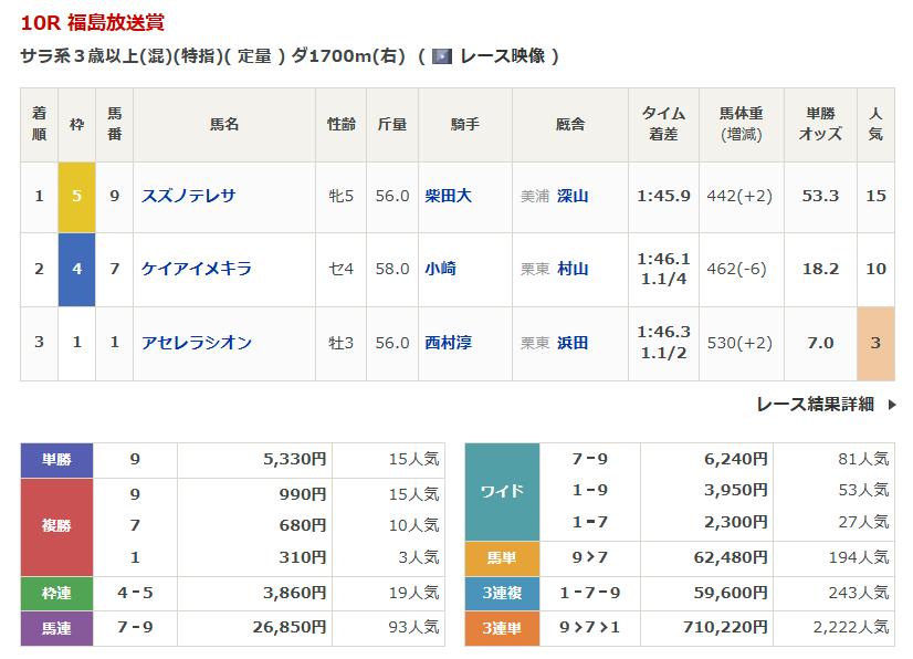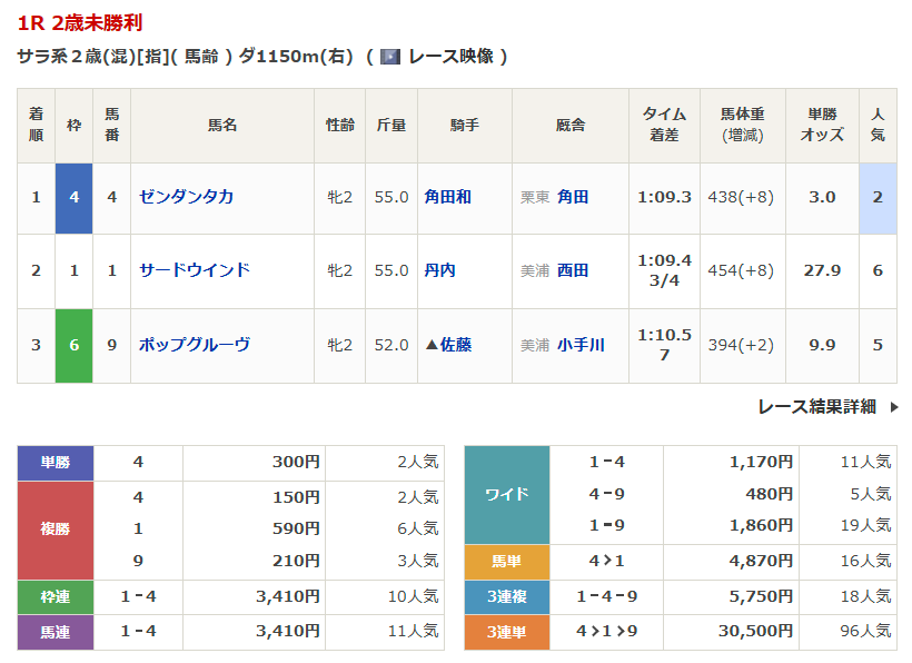 ◎ツインピークス(4人気)1着 単勝800円、複勝160円